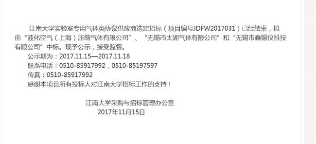 江南大學(xué)實(shí)驗(yàn)室專用氣體類協(xié)議供應(yīng)商選定招標(biāo)(項(xiàng)目編號(hào):JDFW2017031)已結(jié)束,熱烈慶祝鑫錫儀中標(biāo)成為江南大學(xué)氣體供應(yīng)商!